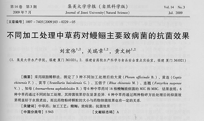 不同加工處理中草藥對鰻鱺主要致病菌的抗菌效果